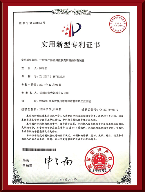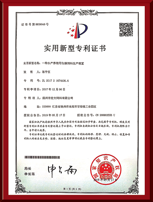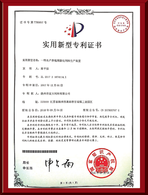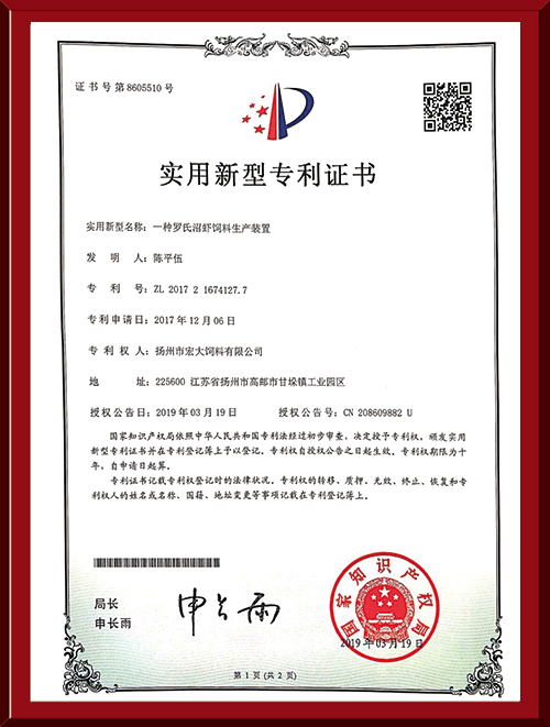 揚(yáng)州市宏大飼料有限公司 揚(yáng)州市宏大飼料有限公司是一家集科研與生產(chǎn)為一體的大型民營企業(yè),座落在魚米之鄉(xiāng)高郵東郊,傍依郵興公路、澄子河,水陸交通便捷,于2002年建成投產(chǎn),占地面積60畝,固定投資1.5億元?,F(xiàn)有7條生產(chǎn)線,其中時(shí)產(chǎn)15噸高檔水產(chǎn)膨化生產(chǎn)線2條,均采用國內(nèi)先進(jìn)的真空后噴涂技術(shù)和低溫烘干技術(shù)(飼料內(nèi)的各種營養(yǎng)不受破損)、臺(tái)灣宜大高檔蝦料生產(chǎn)線2條和魚飼料生產(chǎn)線3條。
